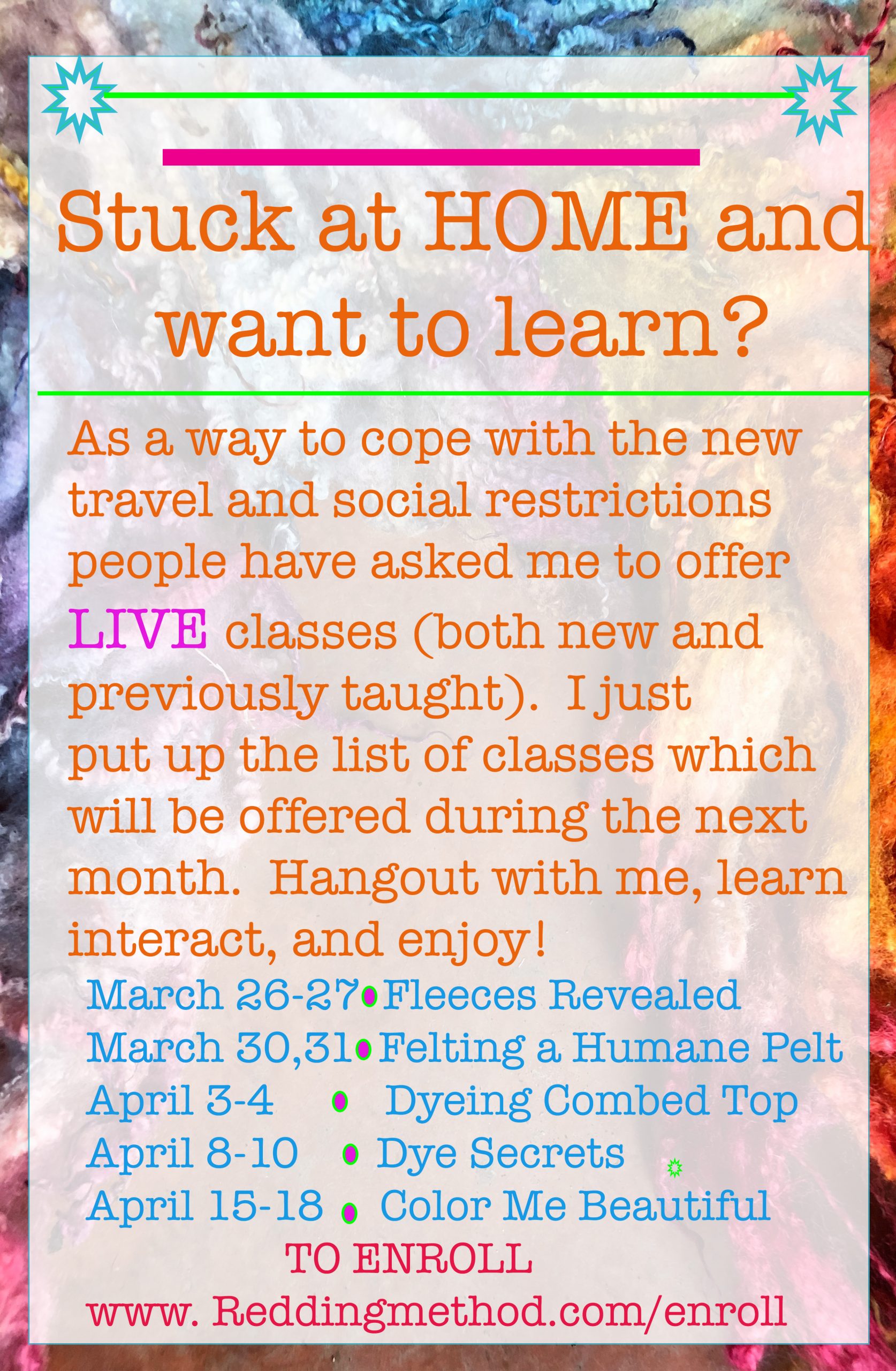 Kill the suck of what’s going on by killing boredom with fiber classes. These are live and you can interact, learn and enjoy with me during my online classes. I put together a bunch of classes in a short amount of time so we can hangout while I teach you my techniques… please check out the flyer below. To enroll, go to ENROLL!. You’ll have fun and I promise, learn A LOT… join me.